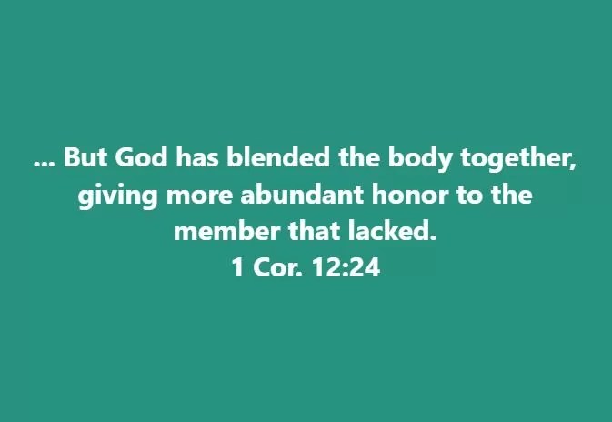 God has blended the body together, giving more abundant honour to the member that lacked so that there would be no division in the Body.