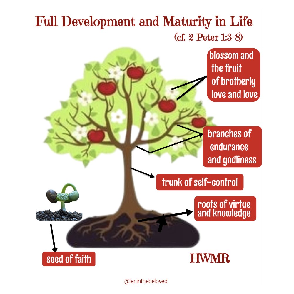 We will have the full development and maturity in life from the seed of faith, through the roots of virtue and knowledge, the trunk of self-control, and the branches of endurance and godliness, to the blossom and the fruit of brotherly love and love (2 Pet. 1:5-8).