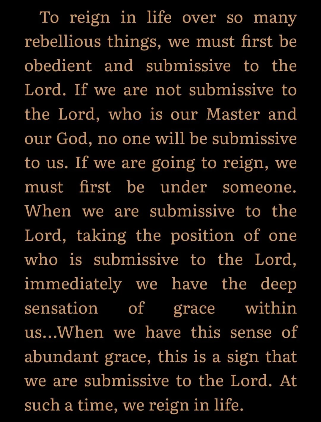 In order for us to reign in life over so many rebellious things in us, we first must be obedient and submissive to the Lord; we need to first submit to God’s authority and then we can reign in life.