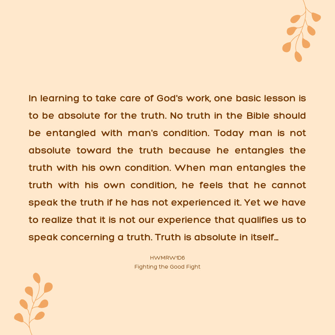 If we uphold the absoluteness of the truth, it will eventually uplift our situation and condition, and we will advance with the Lord.