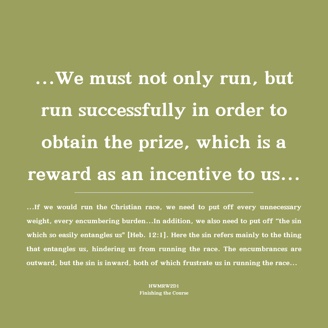 We must run such a race with endurance – enduring opposition, putting away every encumbrance and sin and not faint or grow weary- to finish our course to obtain a special reward.